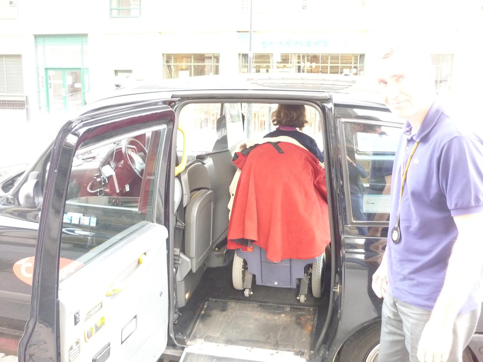 Par contre, alors qu’en France, dans les véhicules aménagés, le fauteuil est attaché au sol, dans les taxis londoniens, il y a aucune attache. Donc je vous déconseille d’avoir un sac à dos attaché au fauteuil par exemple car cela fait bien cabrer et c’est toujours bien qu’un de vos comparses tienne un peu le fauteuil ^^.