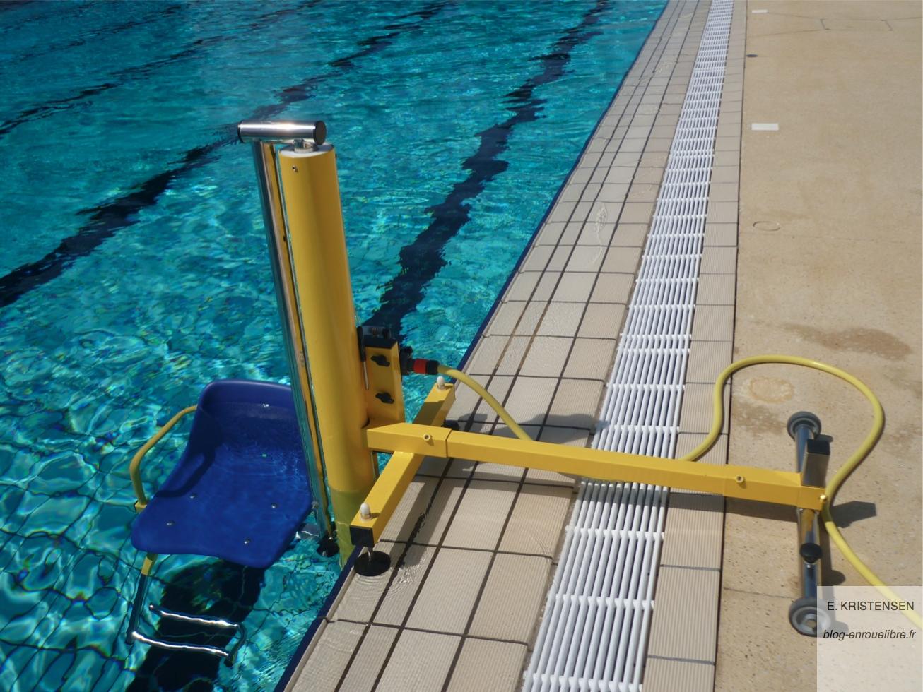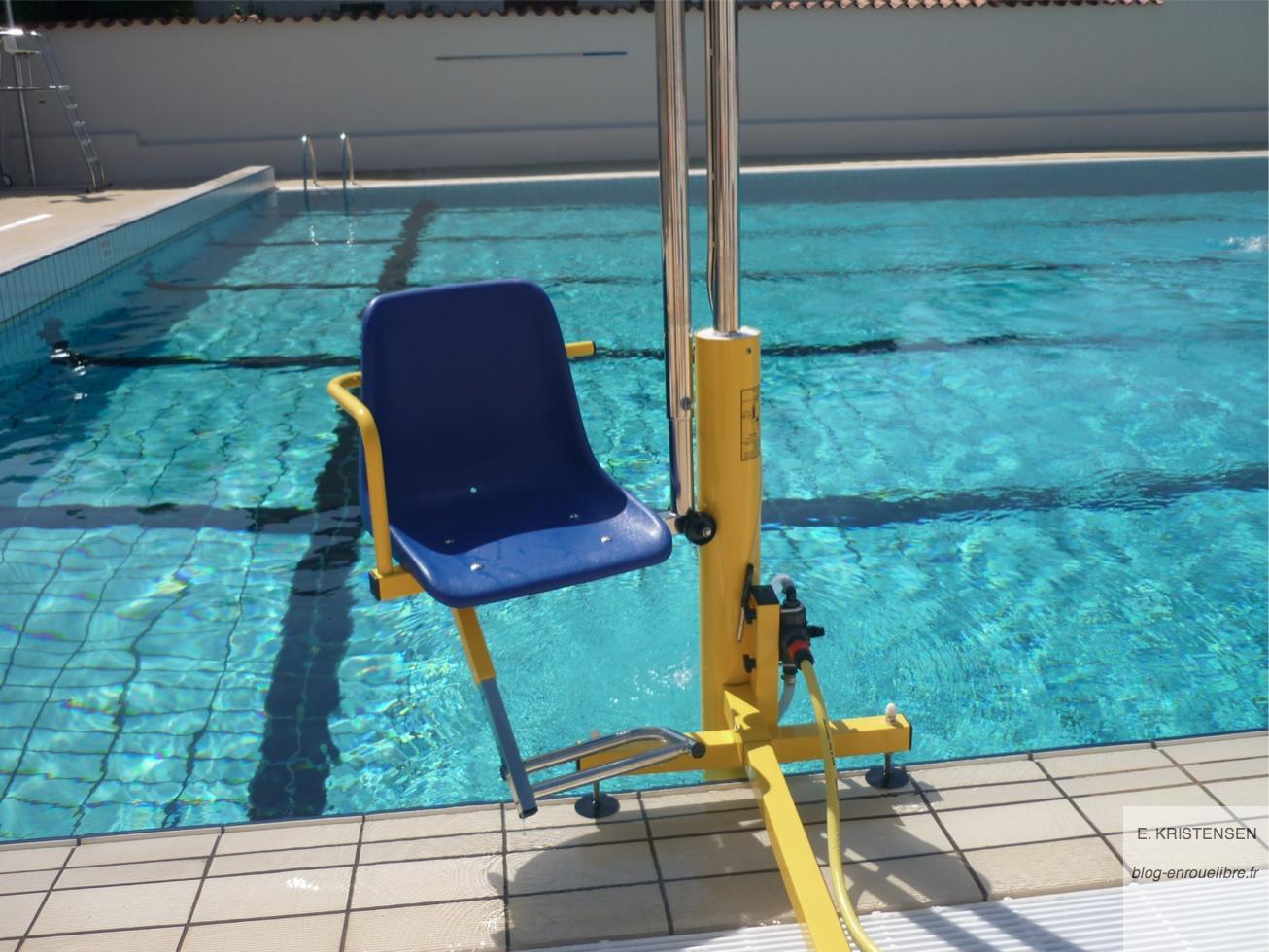 A la piscine, le problème c’est d’aller dans l’eau (et encore on peut toujours faire un plongeon trop classe) et d’en ressortir (et là c’est vraiment difficile). A Rognac, ils ont alors acheté un siège fonctionnant sous pression hydraulique, sous le contrôle des maîtres nageurs :