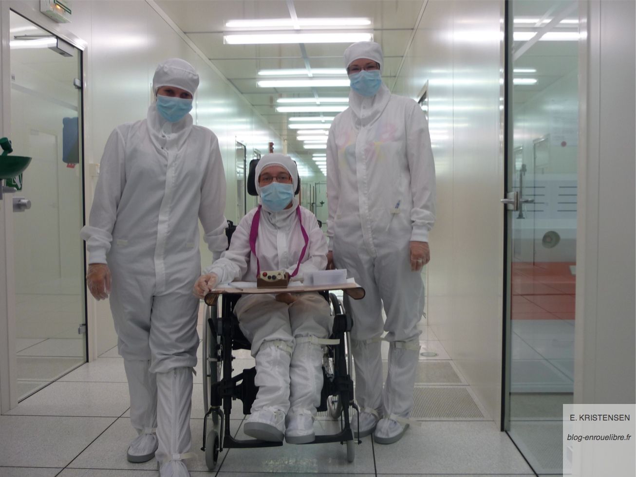 L’an dernier, j’avais un TP à faire dans une salle blanche. Une salle blanche est une salle où la concentration de particule dans l’air est fortement minimisée ce qui nécessite un équipement complètement décontaminé. Donc vous pouvez imaginer le problème : comment faire entrer, entre autre, le fauteuil roulant etc?
