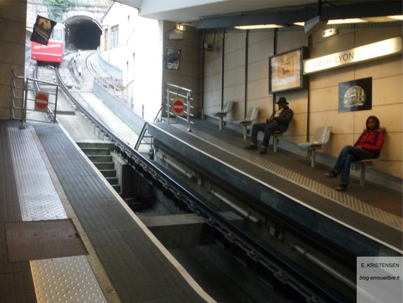Une fois place Bellecour, nous avons marché jusqu’au funiculaire qui permet de monter à la basilique Notre Dame de Fourvière. Le funiculaire est un tramway sur des rails très pentus :